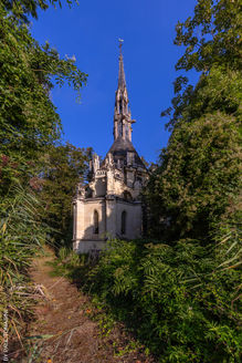Nichée discrètement dans le parc, la chapelle fascine par son architecture et ses vitraux colorés.